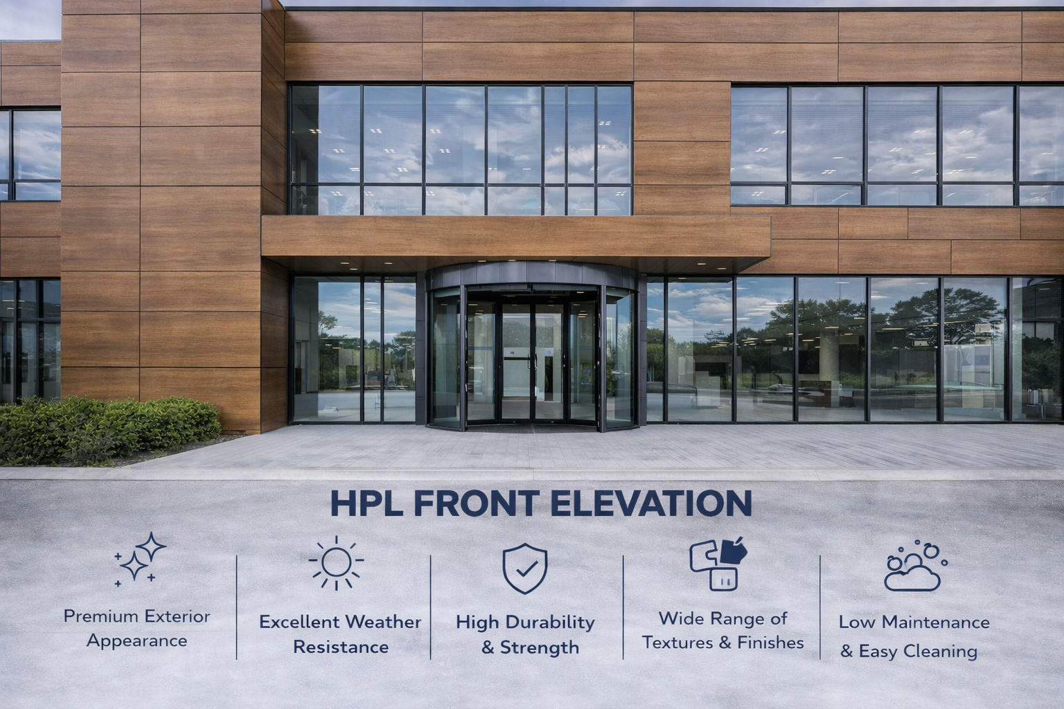 HPL (High Pressure Laminate) front elevation enhances building exteriors with a rich, modern, and high-end visual appeal.