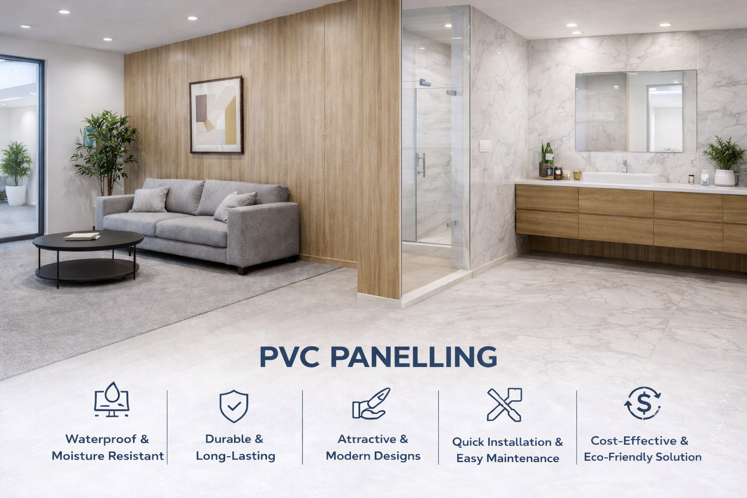 PVC panelling is completely waterproof, making it ideal for bathrooms, kitchens, and areas exposed to humidity.