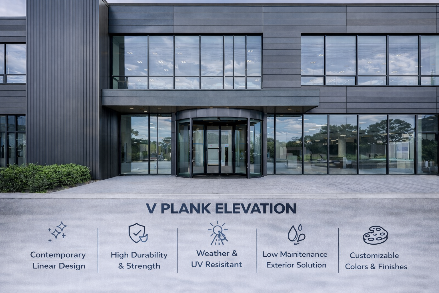 V Plank elevation features a sleek, linear plank pattern that adds a modern and stylish look to building exteriors.